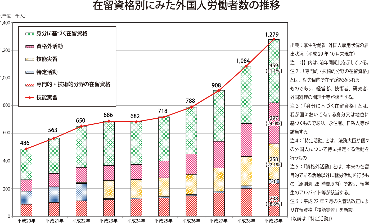 厚生労働省が公表した「外国人雇用状況」の届出状況まとめ【本文】」によると、平成20年に約486万人だった外国人労働者は平成29年には約1,279万人と2.6倍に増加しました。多くの企業が、外国人の雇用に注目し、実際に採用していることがうかがえます。